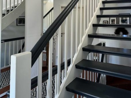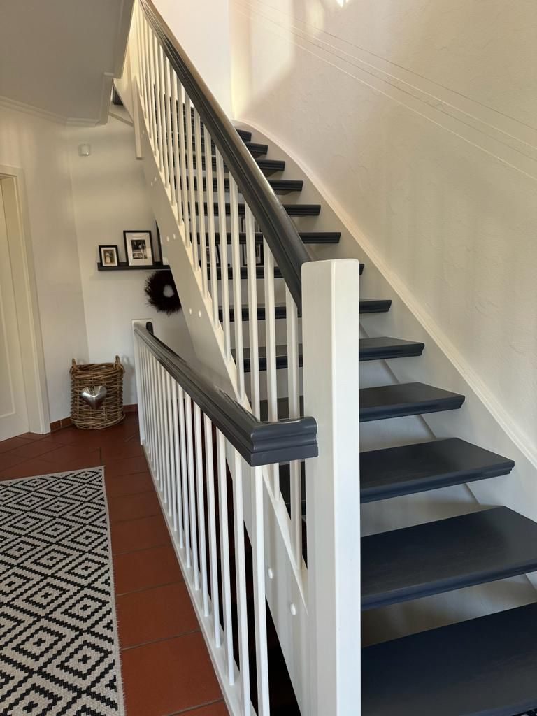 Fertige Treppe bei der wir das Geländer und das Holzwerk Weiß Lackiert haben und die Stufen sowie den Handlauf in Anthrazit abgesetzt haben.