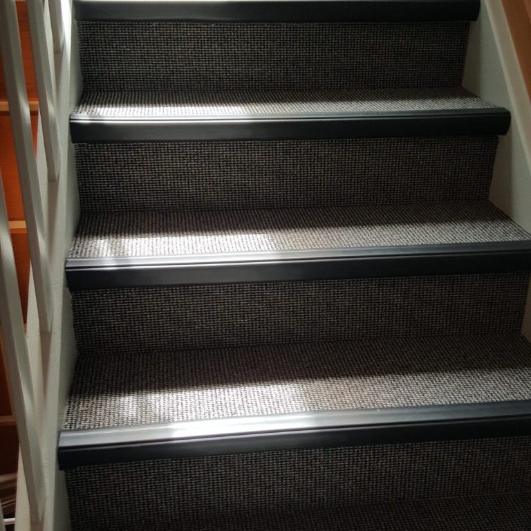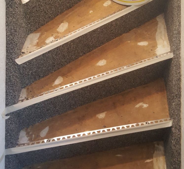 Mit Teppich beklebte Holztreppe. Gummikanten als sauberen Abschluss und Schutz für die Kanten.